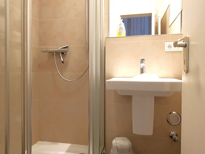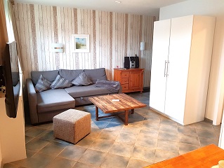 Die bequeme Sitzgarnitur lässt Sie entspannt den Abend genießen. Das moderne Badezimmer mit halbrunder Duschkabine in freundlicher Farbgestaltung hält selbstverständlich auch einen Fön für Sie bereit.