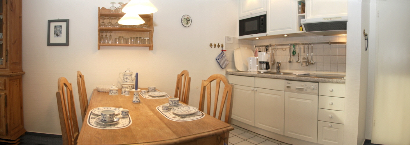Die offene Küche ist komplett ausgestattet. Es stehen Ihnen zwei Schlafräume zur Verfügung.