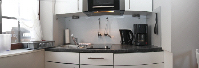 Die Küchenzeile ist geschickt in den Wohnbereich integriert, ohne störend zu wirken.
