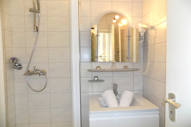 Die bequeme Sitzgarnitur lässt Sie entspannt den Abend genießen. Das moderne Badezimmer mit halbrunder Duschkabine in freundlicher Farbgestaltung hält selbstverständlich auch einen Fön für Sie bereit.