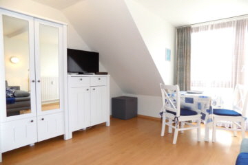 Ansprechendes Wohnzimmer mit separatem Esstisch und kleiner Küchenzeile. Ein Schlafzimmer mit zwei Einzelbetten und ein Bad mit Dusche warten hier auf Sie. Die Schlafcouch im Wohnzimmer kann bequem als Doppelbett genutzt werden.
