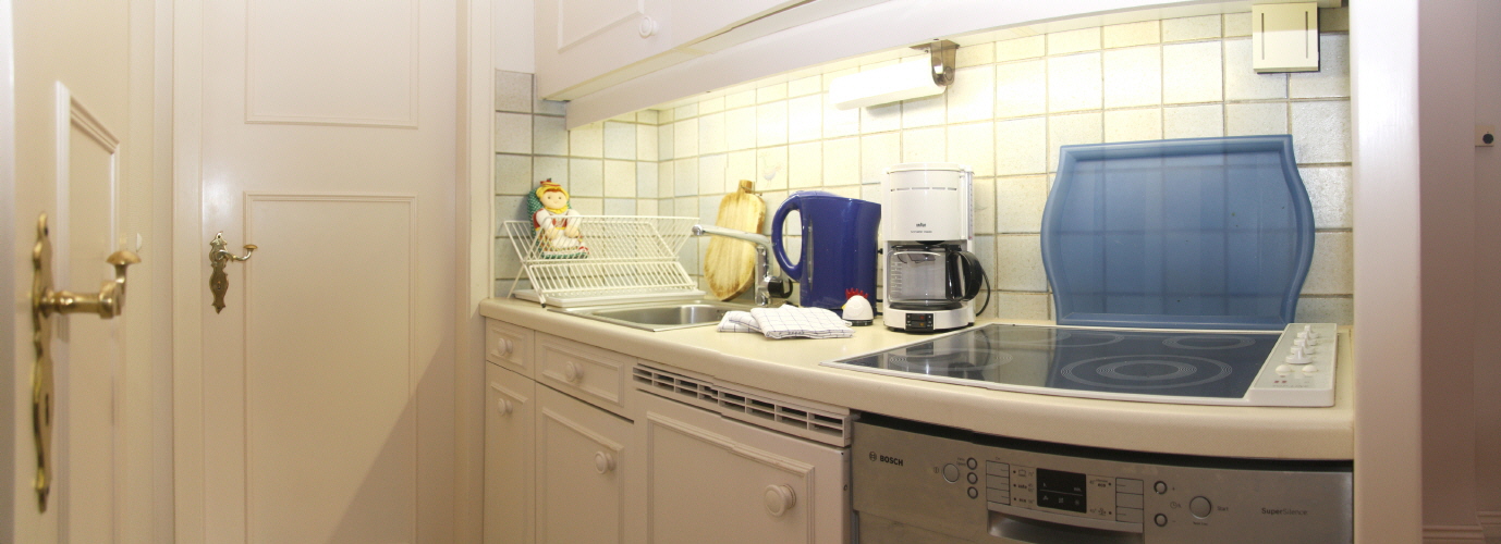 In der komplett ausgestatteten Küchenzeile finden Sie das Cerankochfeld, den Geschirrspüler und die Mikrowelle.