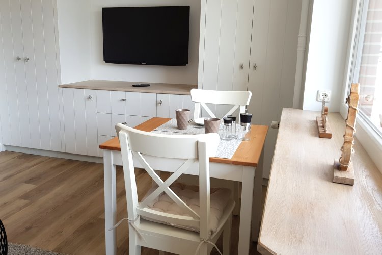 Es steht Ihnen eine kleine Küchenzeile mit Mikrowelle und ein separater Essplatz zur Verfügung.