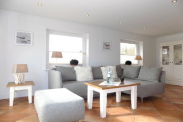 Hochwertige Sitzecke und geschmackvolle Ausstattung im großzügigen Wohnbereich vor der sonnigen Terrasse.