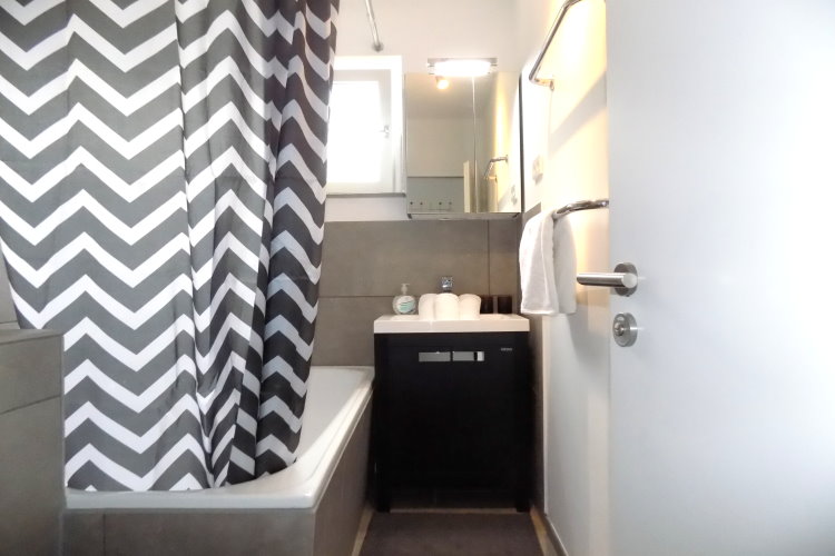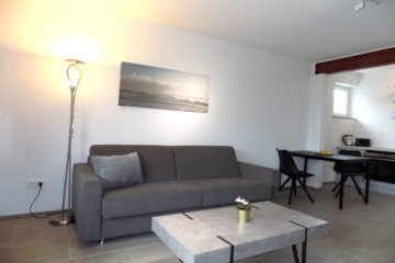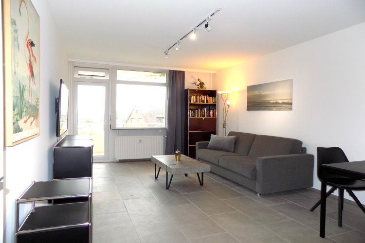 Die helle Wohnung hat ein gemütliches Wohnzimmer mit bequemem Sofa und extra Esstisch, separates Schlafzimmer mit luxuriösem großen Doppelbett mit Wendematratze für verschiedene Liegehärten und ein Badezimmer mit Wannenbad mit Duschabtrennung.