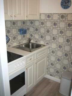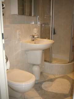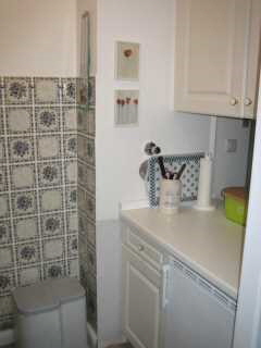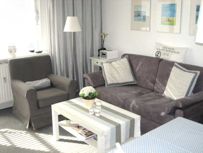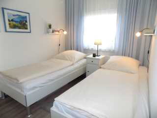 Die helle Wohnung hat ein separates Schlafzimmer mit zwei Einzelbetten, und ein Badezimmer mit Duschbad und mit Fön.