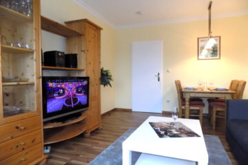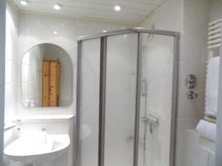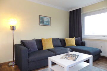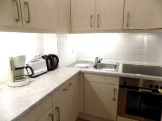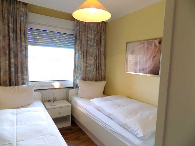 Die helle Wohnung hat ein separates Schlafzimmer mit zwei Einzelbetten und ein Badezimmer mit Duschbad und mit Fön.