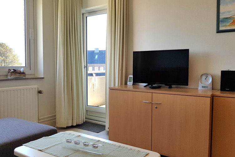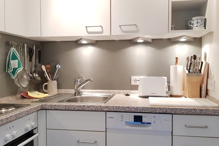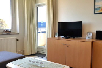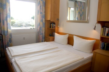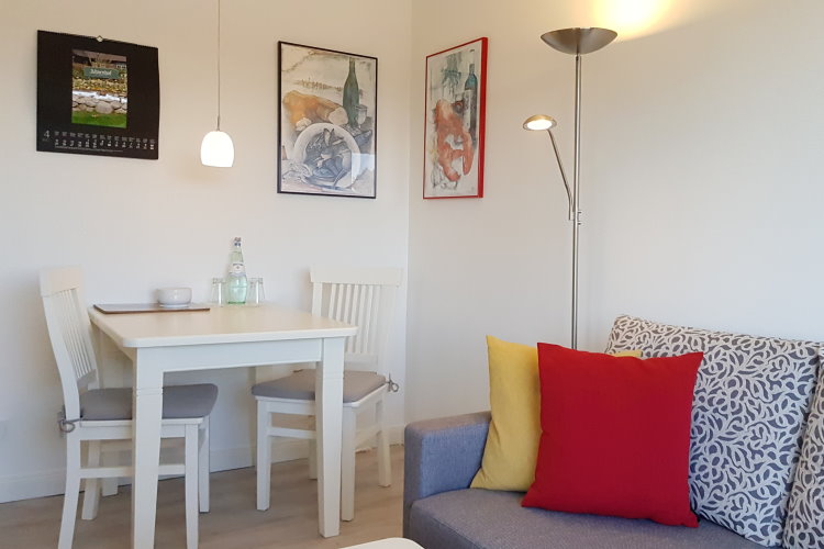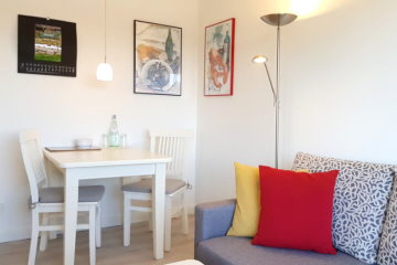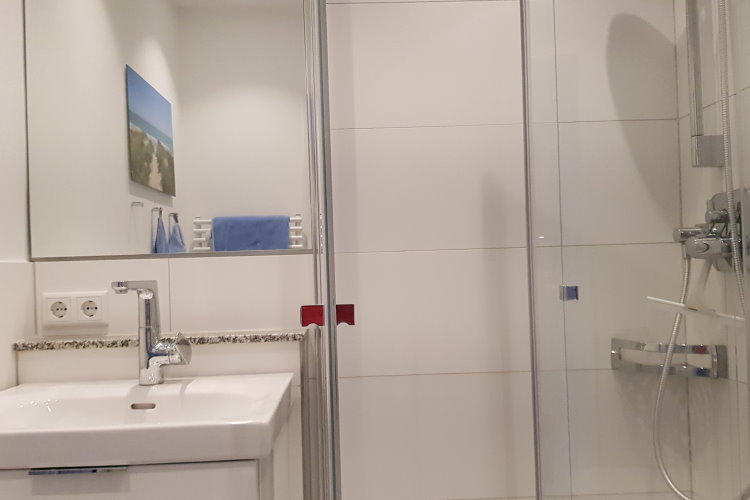 Die helle Wohnung hat ein separates Schlafzimmer mit Ehebett und ein Badezimmer mit Duschbad und mit Fön.