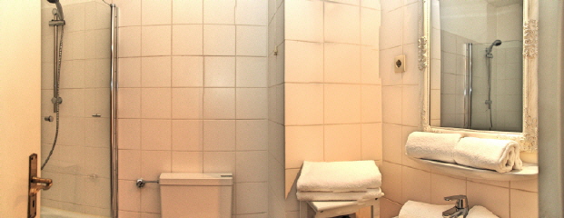 Die helle Wohnung hat ein geräumiges Schlafzimmer mit Doppelbett und ein großes Badezimmer mit Fön. Die Badewanne hat eine Duschabtrennung.