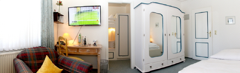 Viele unserer Doppelzimmer haben noch einen zusätzlichen Raum mit einem Einzelbett oder einem normalgroßen Etagenbett. Alle unsere Zimmer verfügen selbstverständlich über Dusche/WC, Farb-TV mit Kabelanschluss, Telefon, Radio, Zimmersafe und Minibar. Es sind ausreichend Schrankflächen auch für einen längeren Aufenthalt vorhanden. Selbstverständlich können Sie überall das WLAN kostenfrei nutzen.